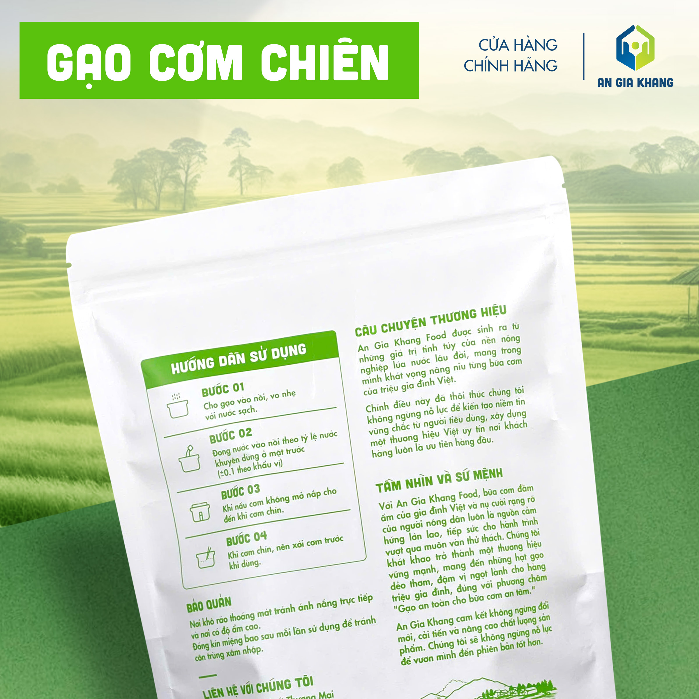 Được đóng gói kỹ lưỡng, bảo quản đúng tiêu chuẩn và không sử dụng chất tạo mùi, gạo Cơm Chiên An Gia Khang đảm bảo an toàn, sạch gạo, cho bạn bữa cơm tròn vị và yên tâm mỗi ngày.