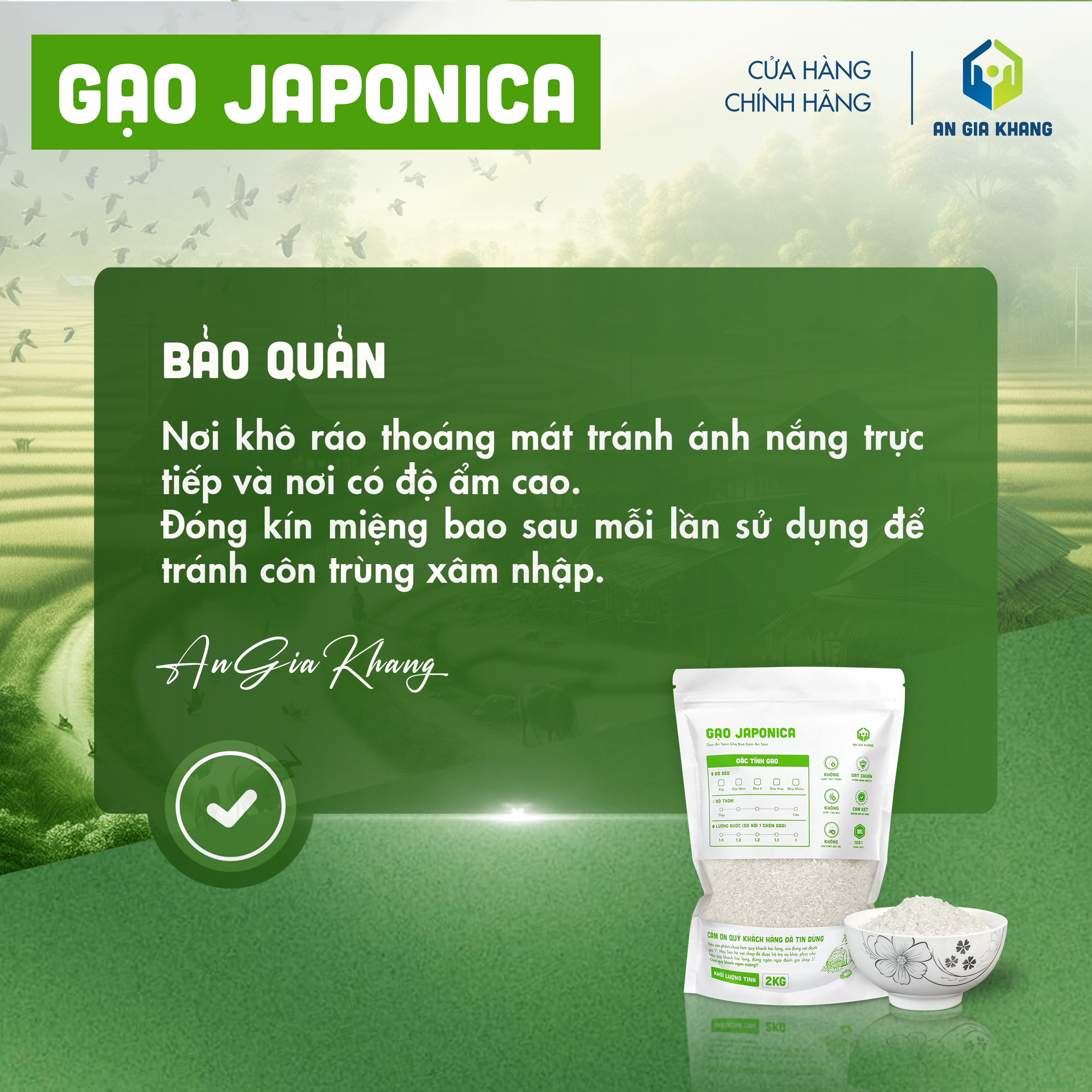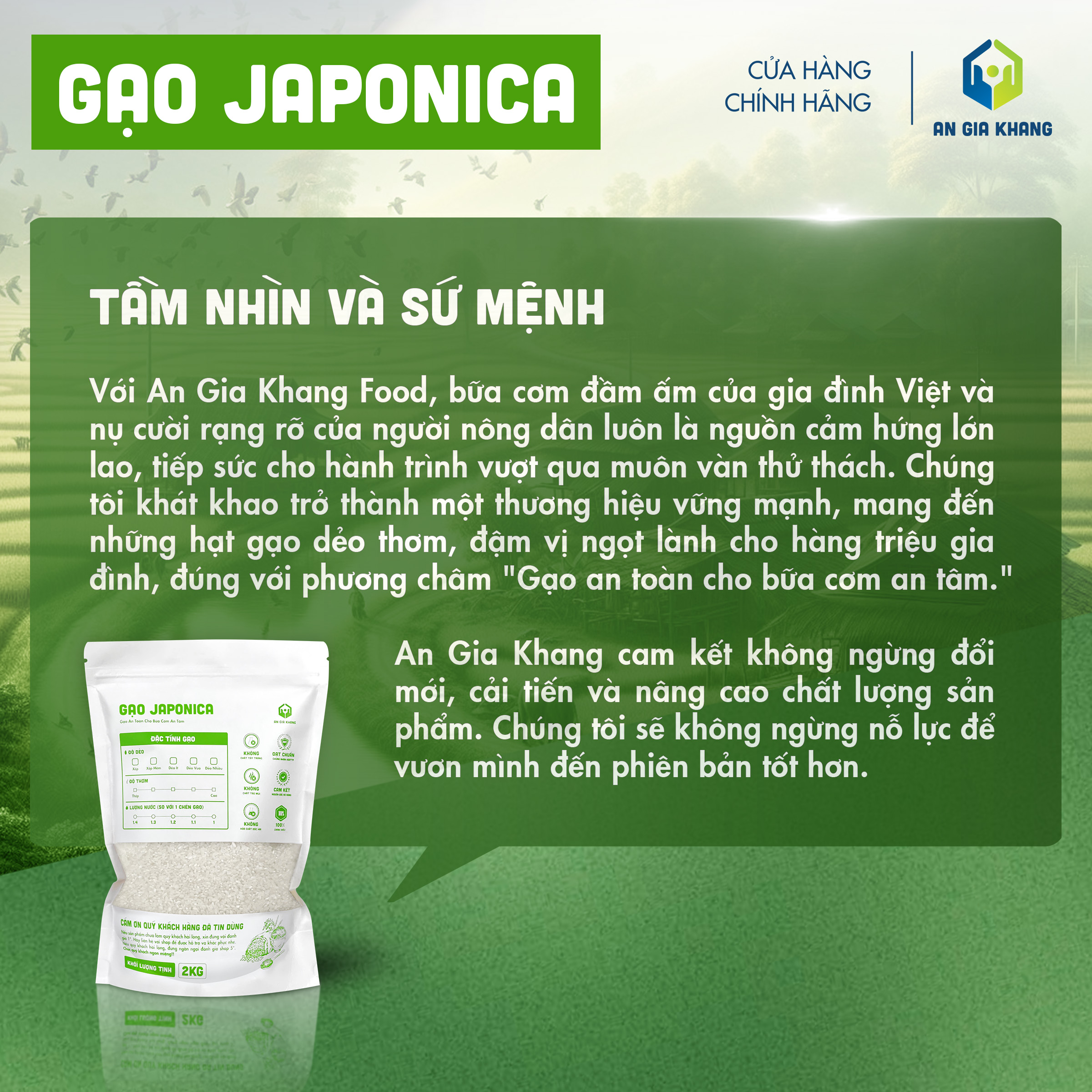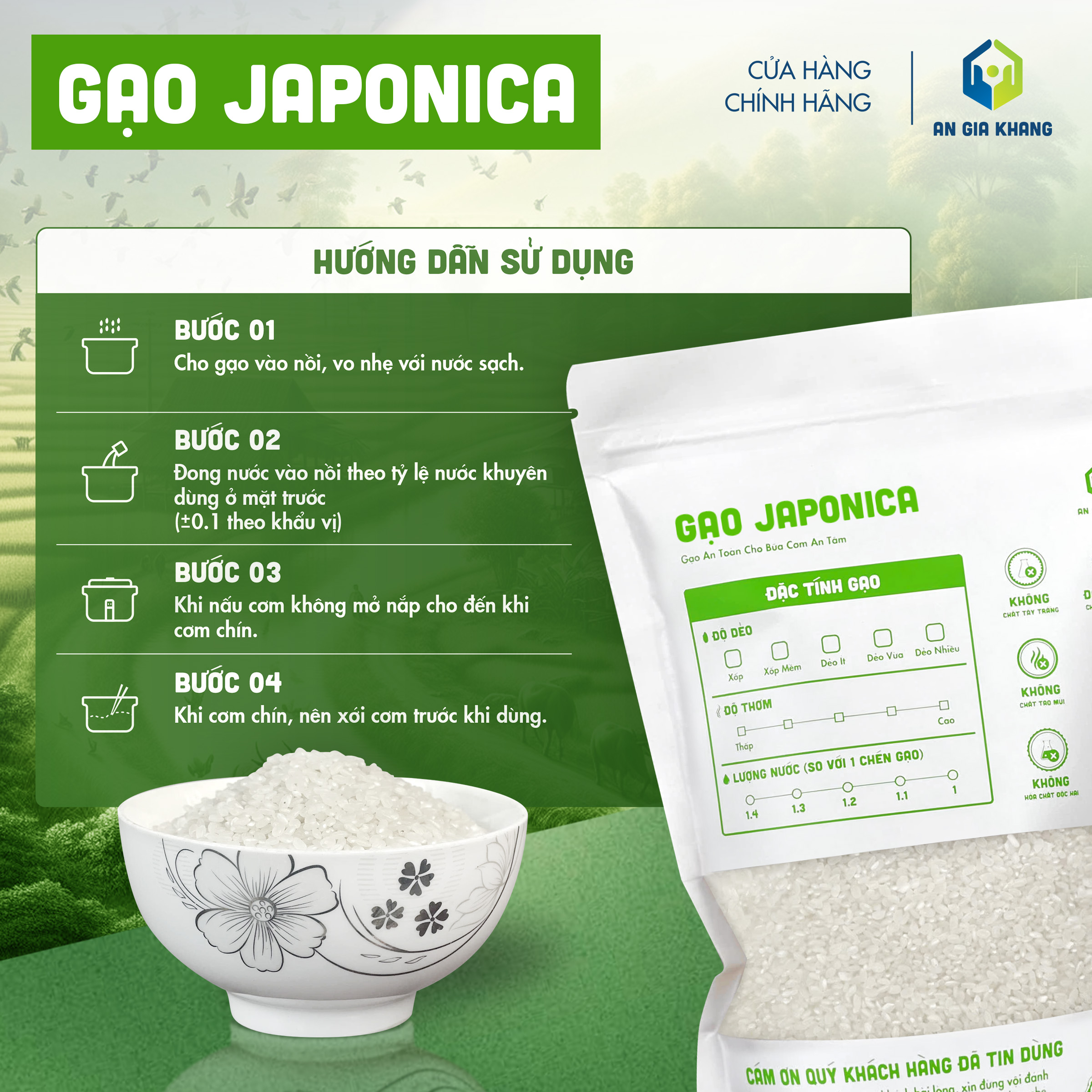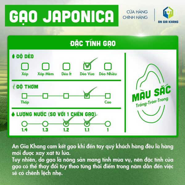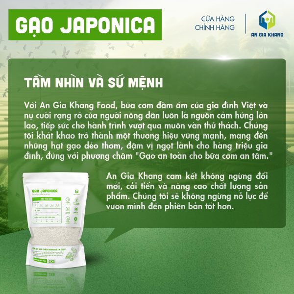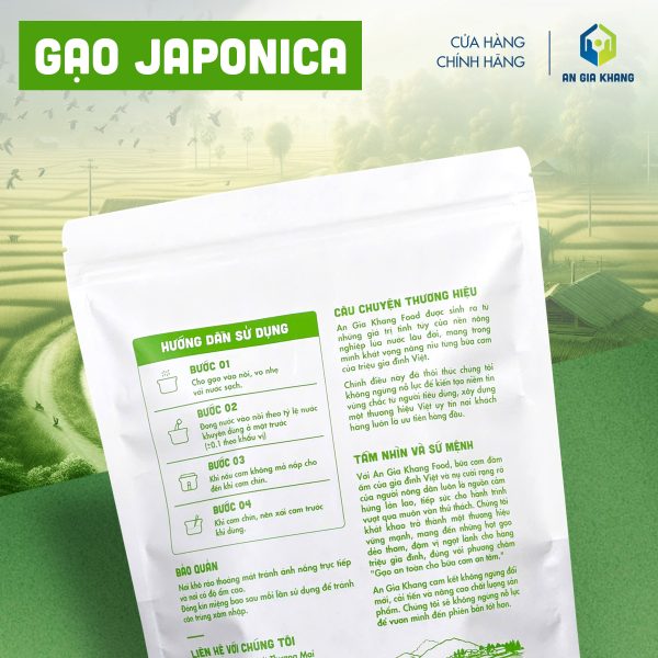 Gạo Japonica An Gia Khang được canh tác và thu hoạch theo quy trình kiểm soát nghiêm ngặt, không sử dụng chất tẩy trắng hay hương liệu. Đóng gói chắc chắn, sạch sẽ, tiện lợi cho cả gia đình sử dụng mỗi ngày hoặc cho nhà hàng, quán ăn cần nguồn gạo chất lượng, ổn định lâu dài.