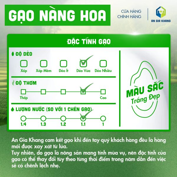 Gạo Nàng Hoa An Gia Khang là dòng gạo thơm truyền thống được nhiều gia đình Việt tin dùng nhờ hương vị dễ ăn, dẻo vừa, ngọt hậu và đặc biệt phù hợp với khẩu vị ba miền. Hạt gạo có hình dáng thon dài, trắng trong, đều hạt, ít bạc bụng. Khi nấu lên, cơm chín tơi xốp, dẻo nhẹ, thơm dịu, không bị khô cứng cũng không quá dính, rất phù hợp cho cả người lớn lẫn trẻ nhỏ.