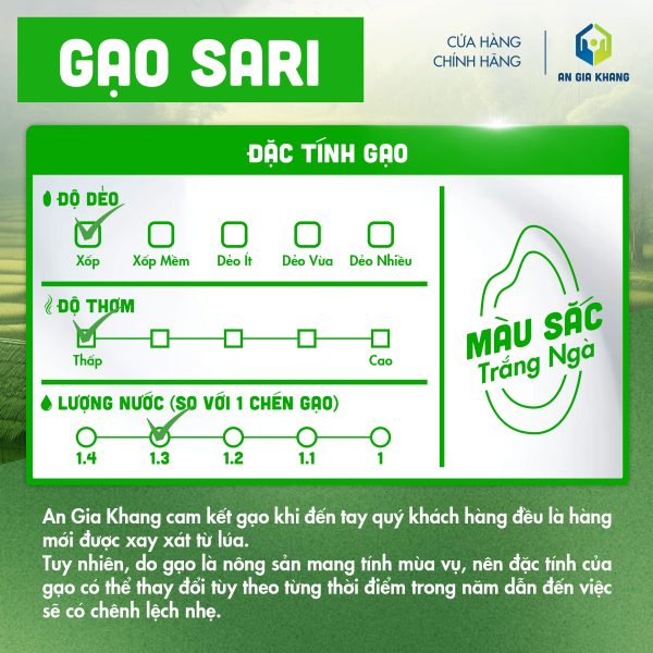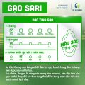 Gạo Sari cho cơm xốp, nở nhiều, là đặc sản gạo ngon vùng đồng bằng sông Cửu Long được nhiều người tiêu dùng yêu thích. Gạo có đặc điểm hạt gạo to tròn, có màu trắng trong. Khi nấu thành cơm ăn vào có vị ngọt nhẹ, tơi xốp và mềm.