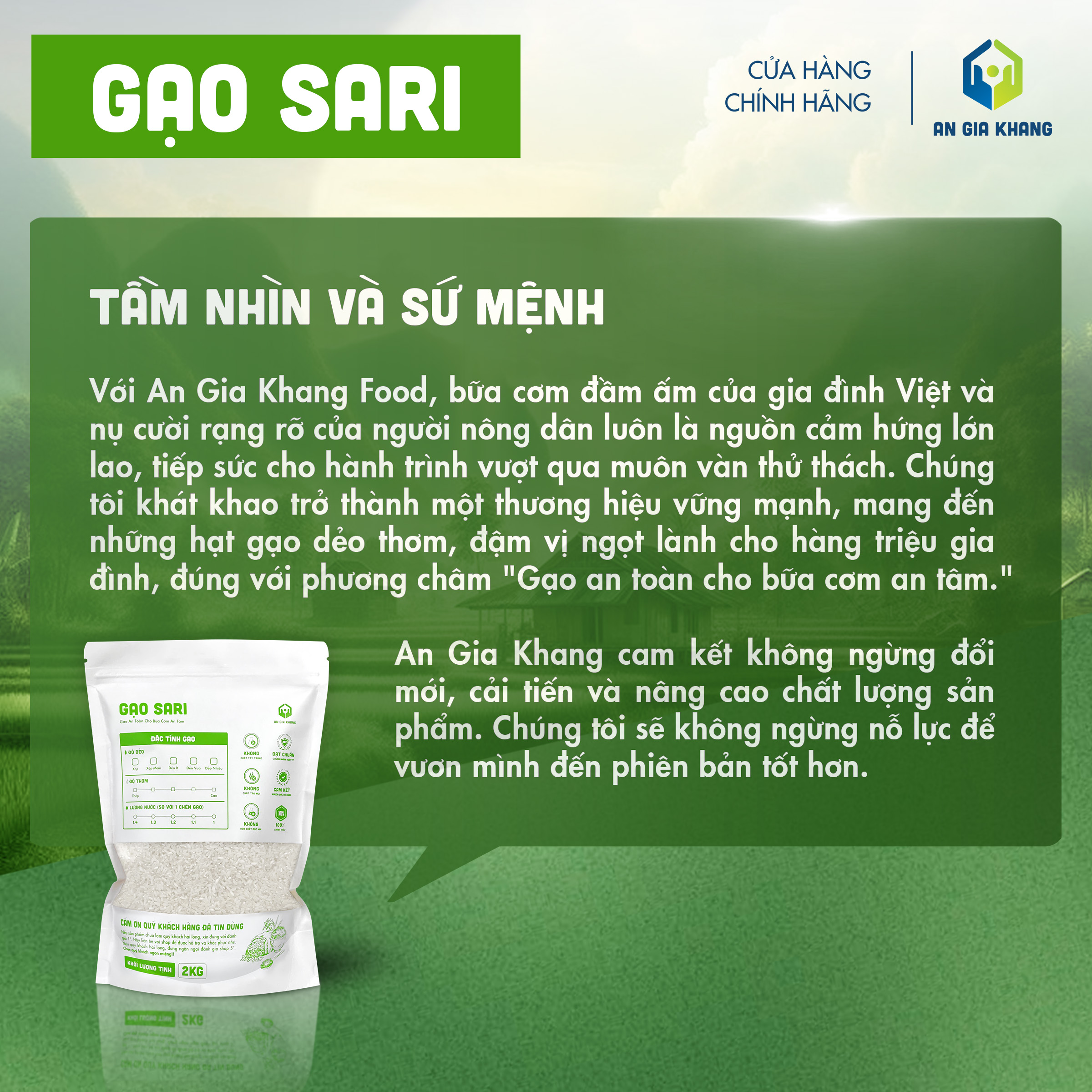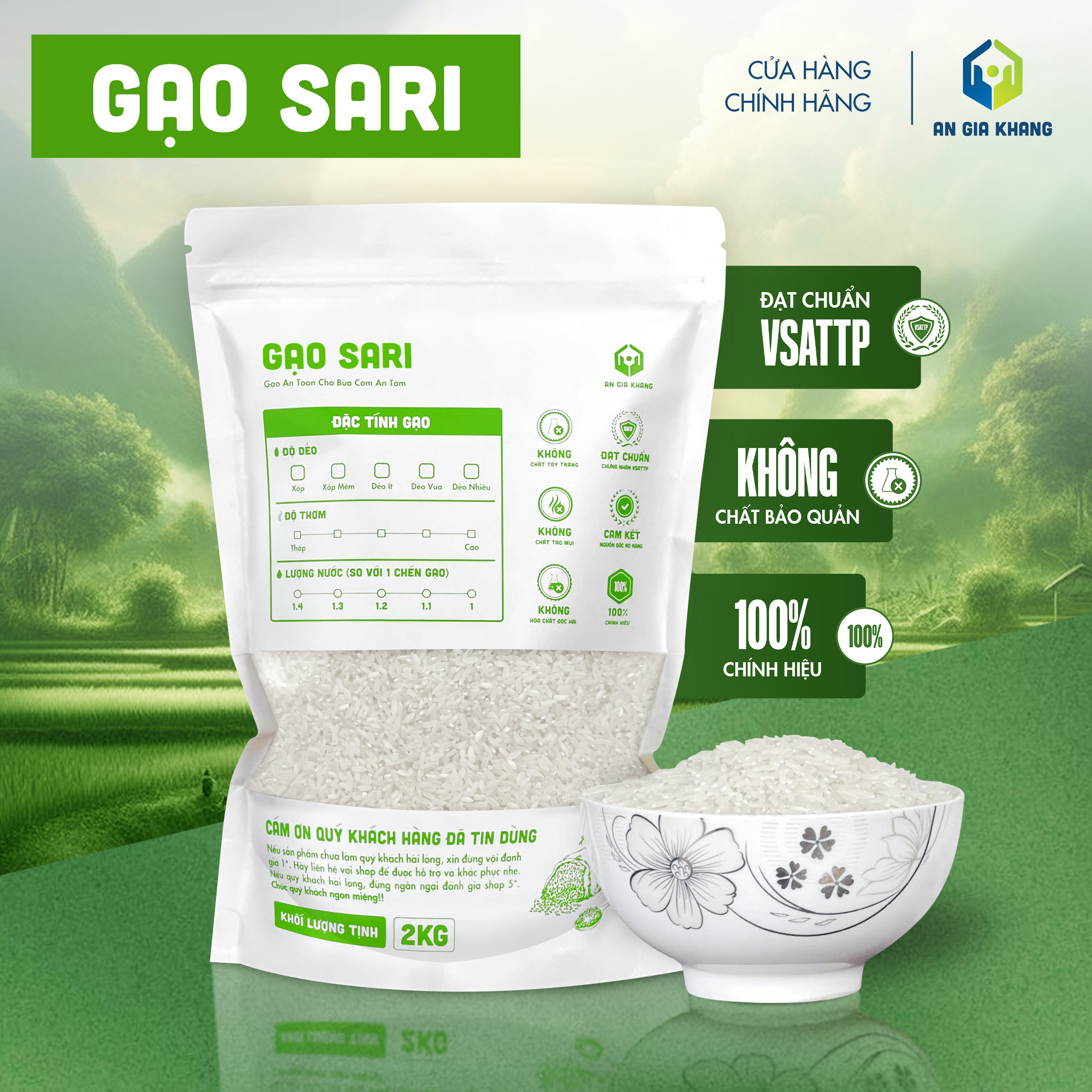 Được canh tác theo quy trình sạch, không sử dụng chất tẩy trắng hay tạo mùi, gạo RVT An Gia Khang là lựa chọn an toàn và thơm ngon cho những ai yêu thích dòng gạo thơm dẻo tự nhiên.