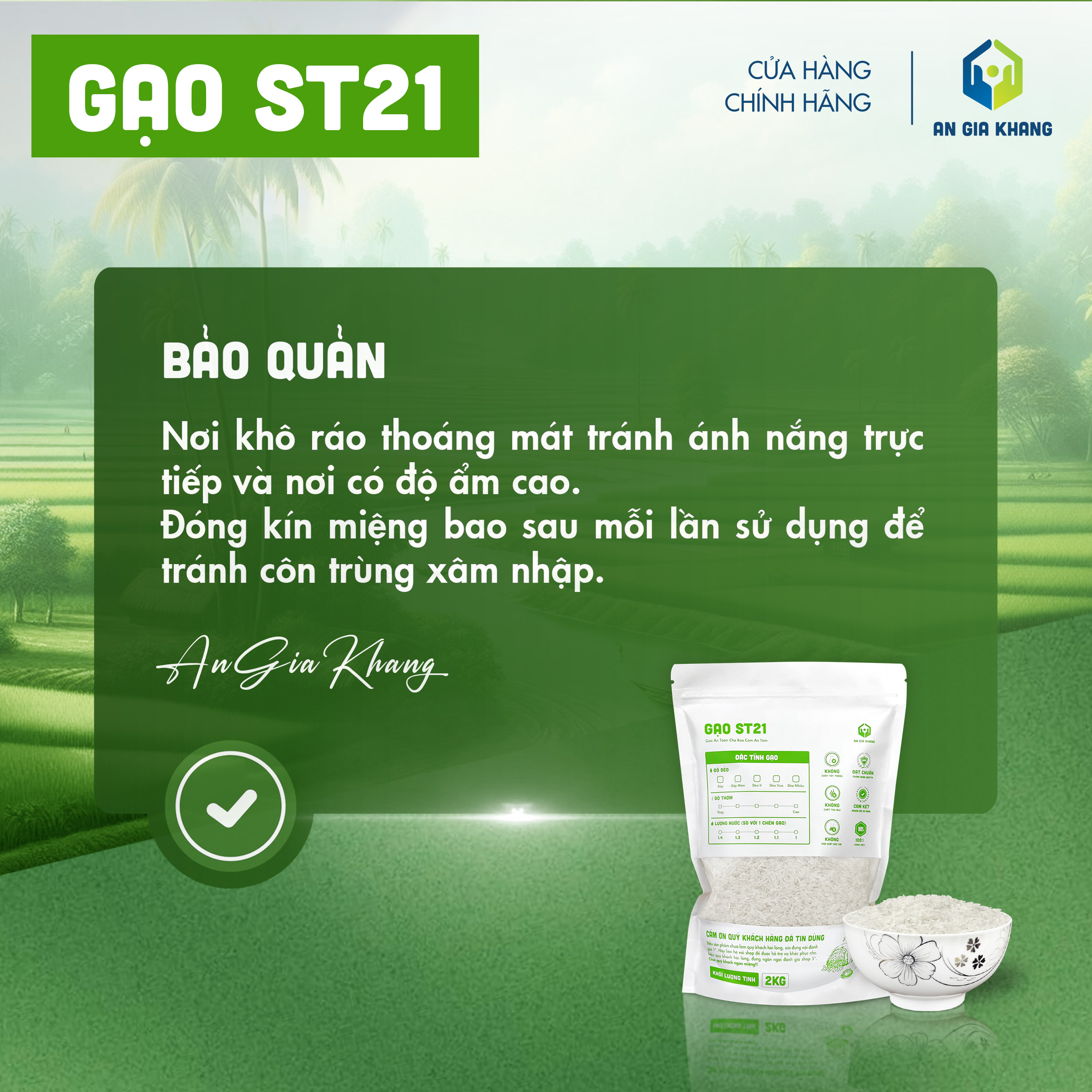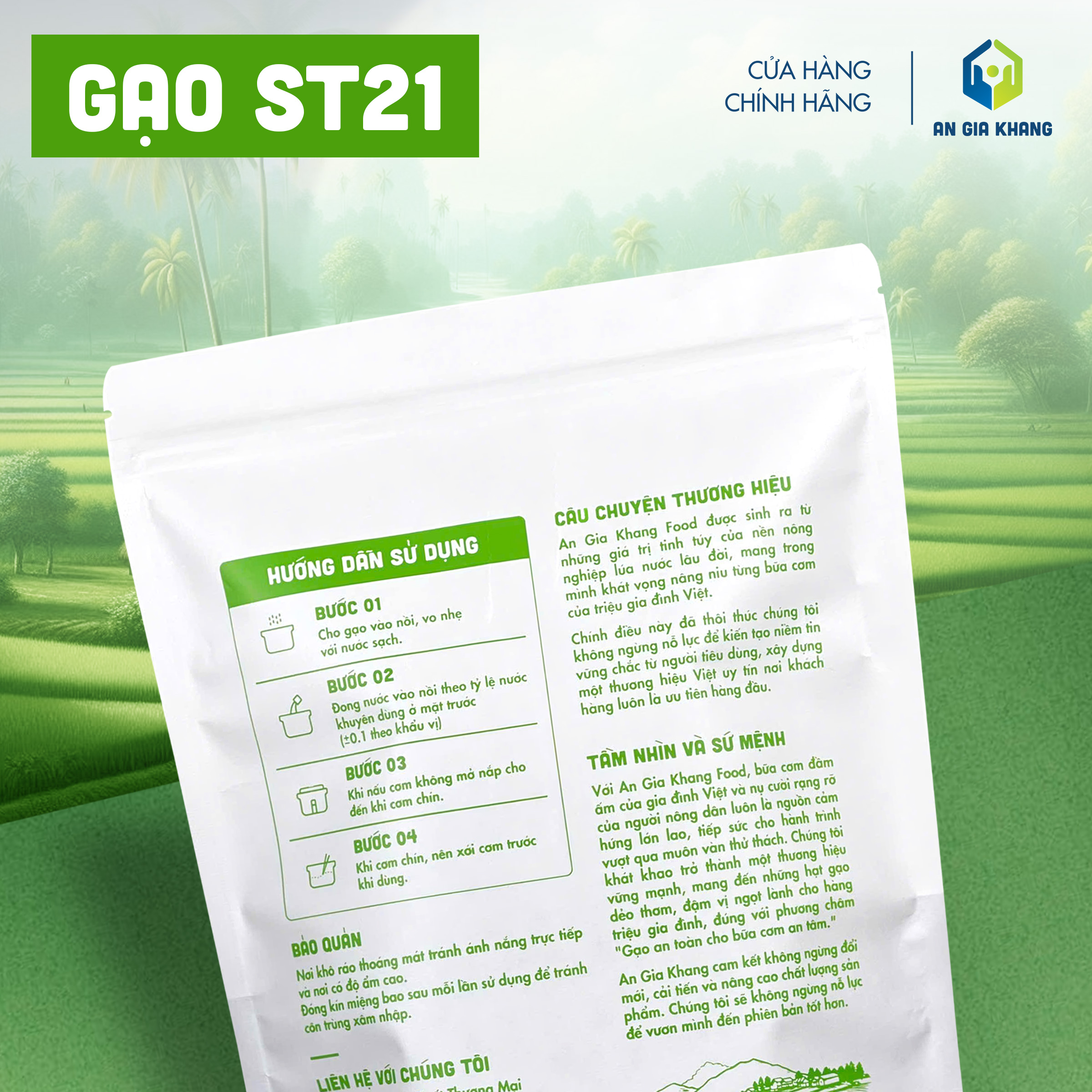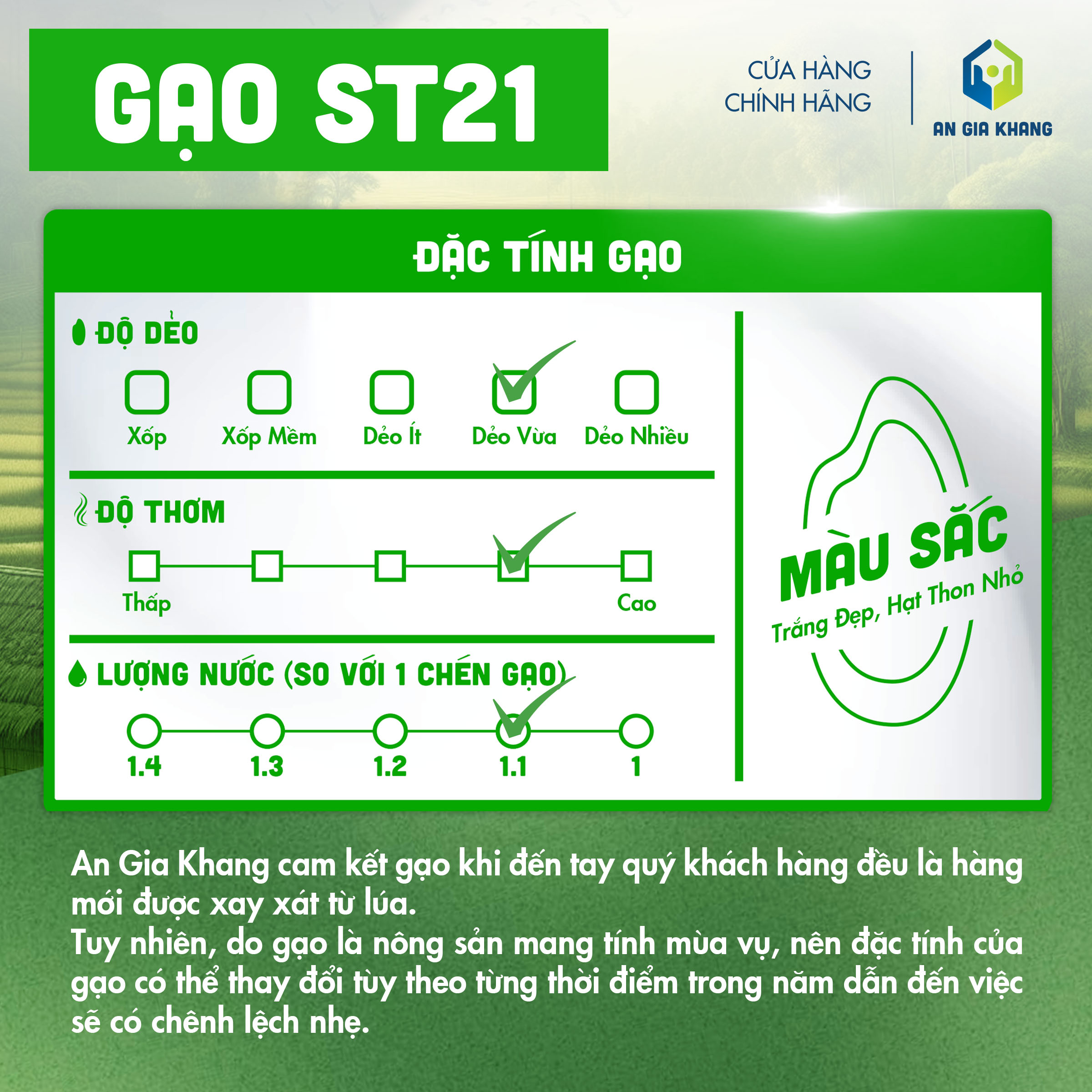 Được canh tác theo quy trình sạch, không sử dụng chất tẩy trắng hay tạo mùi, gạo ST21 An Gia Khang là lựa chọn an toàn và thơm ngon cho những ai yêu thích dòng gạo thơm dẻo tự nhiên.