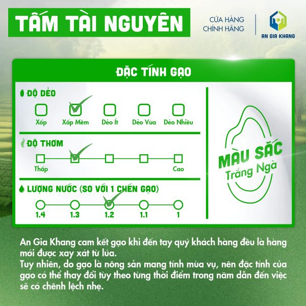 Gạo tấm Tài Nguyên có hương vị tự nhiên cho cơm xốp mềm, hạt cơm vẫn giữ được sự tơi cơm vốn có và đậm vị. Tấm Tài Nguyên là loại gạo tấm xốp mềm thích hợp với những người thích ăn cơm xốp. Hạt cơm tấm Tài nguyên thậm chí vẫn ngon sau khi để nguội. Trong tấm Tài Nguyên vẫn giữ được nhiều phôi và cám gạo, nhiều thành phần dinh dưỡng vì thế mà khi dùng gạo tấm Tài Nguyên rất tốt cho người tiêu dùng.