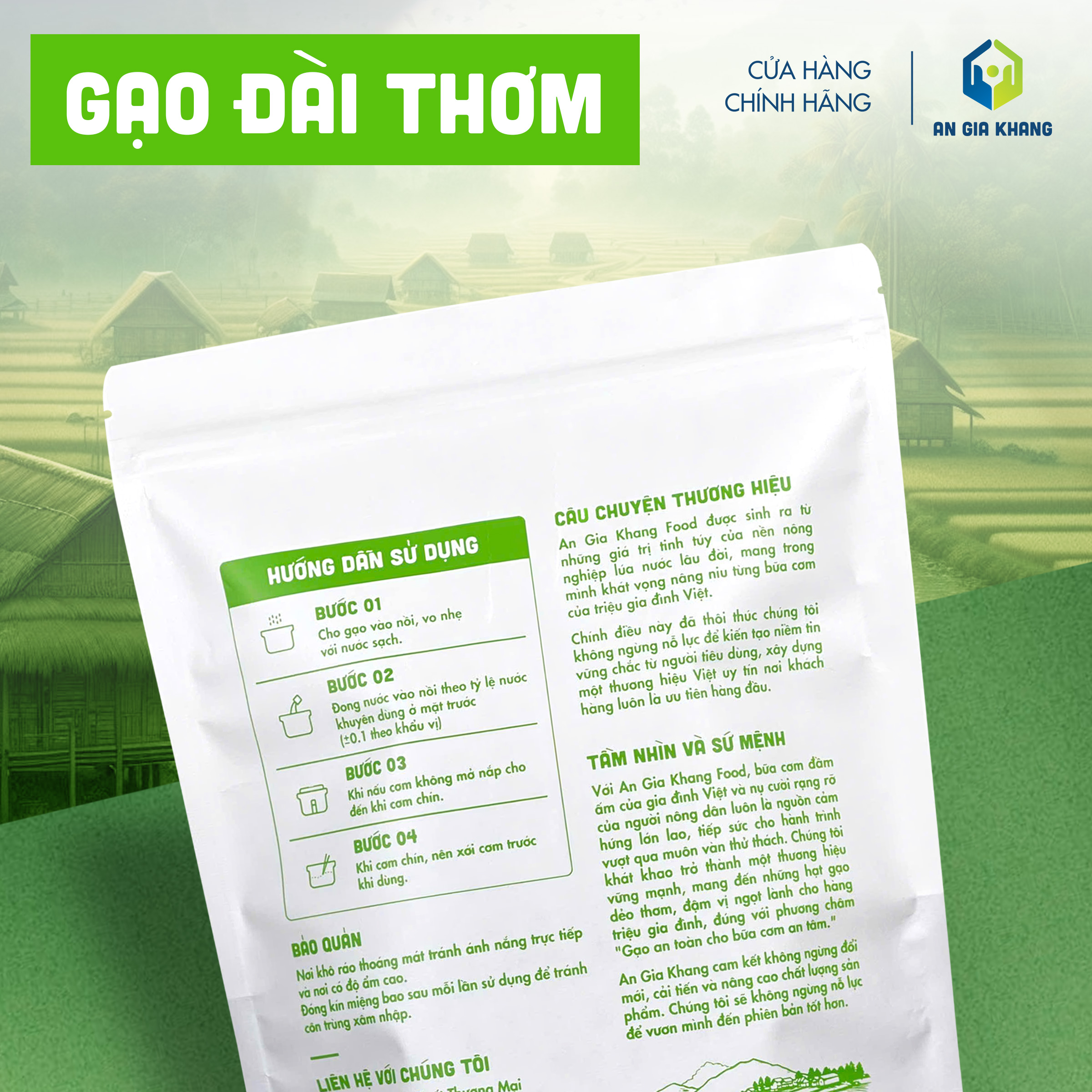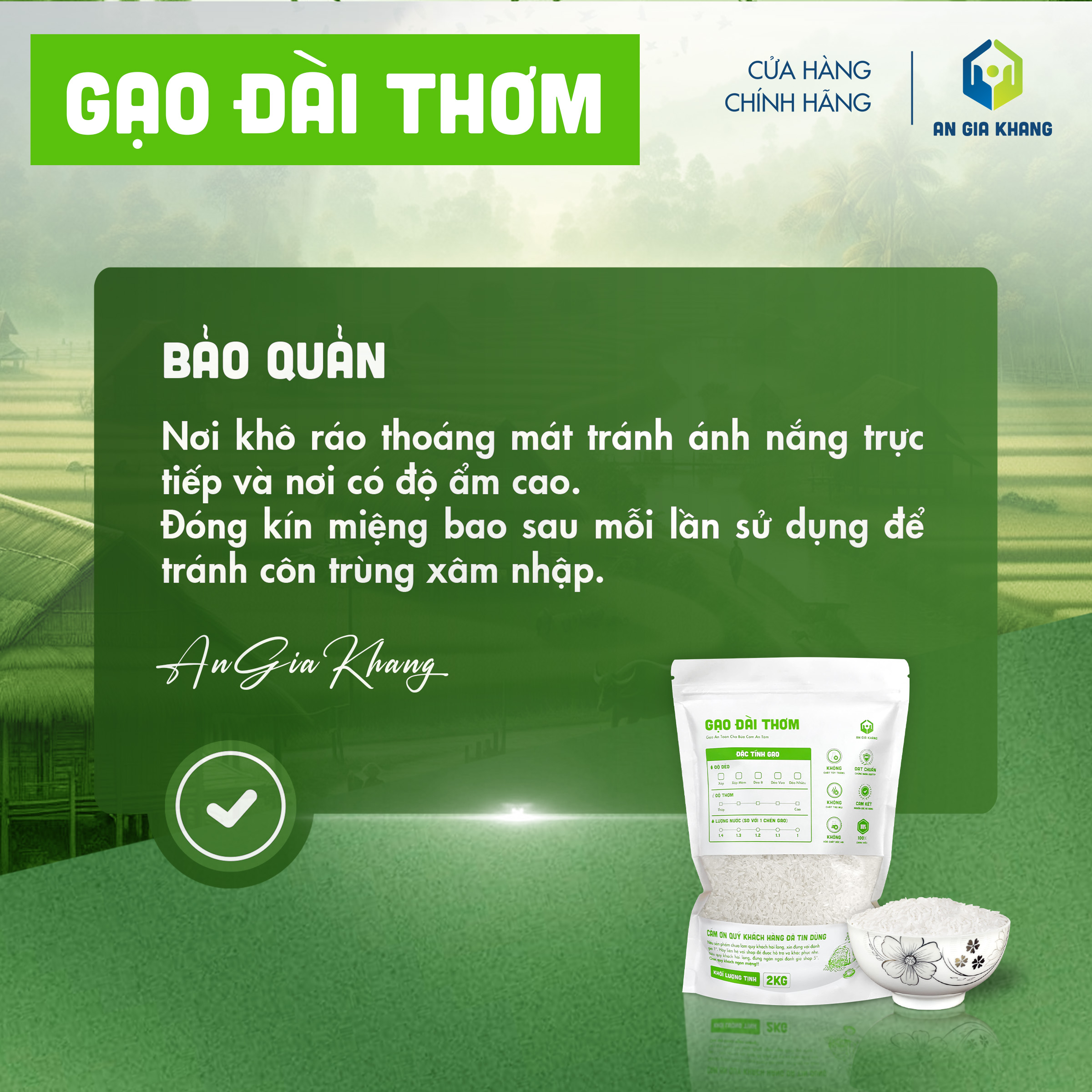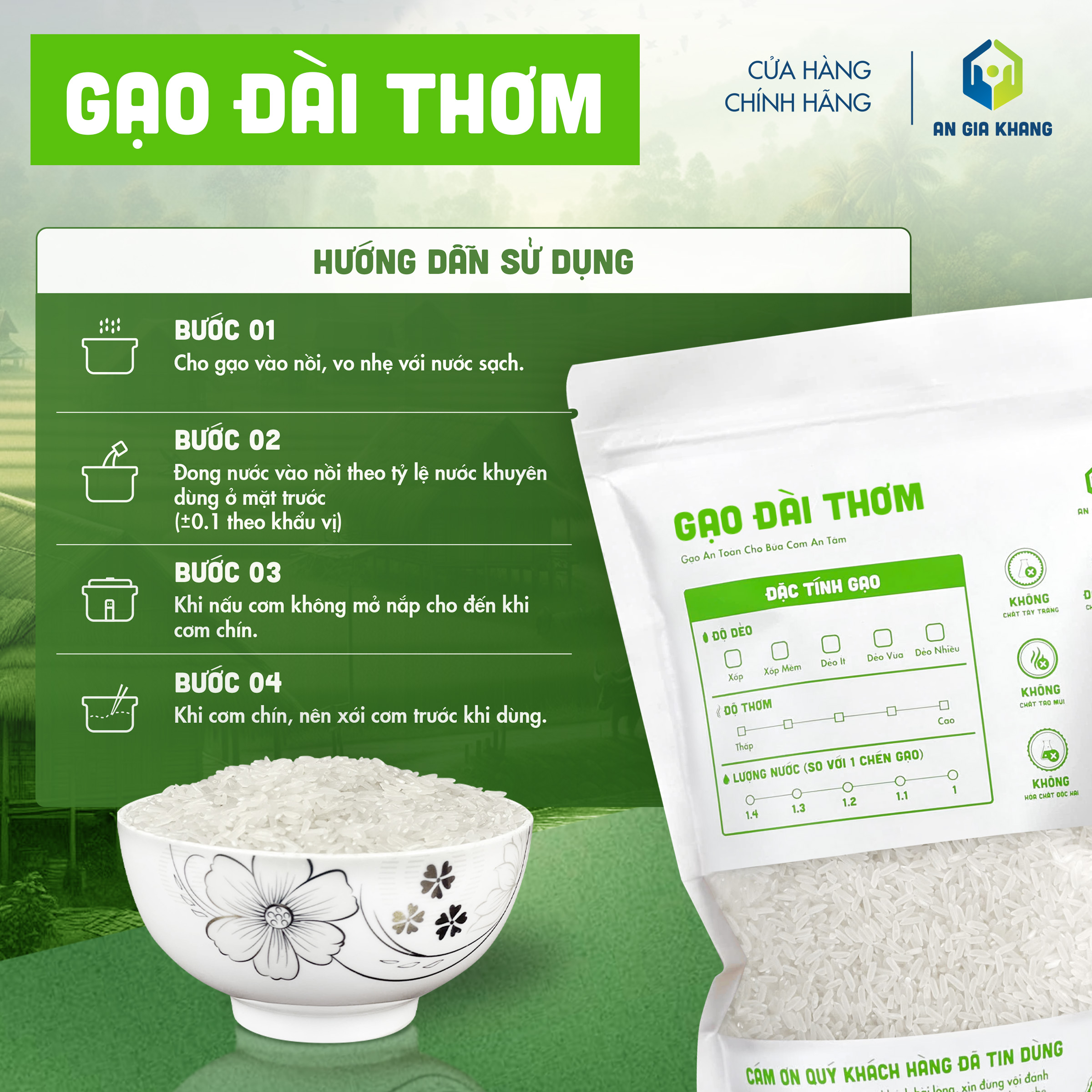 Được đóng gói kỹ lưỡng, bảo quản đúng tiêu chuẩn và không sử dụng chất tạo mùi, gạo Samo An Gia Khang đảm bảo an toàn, sạch gạo, cho bạn bữa cơm tròn vị và yên tâm mỗi ngày.