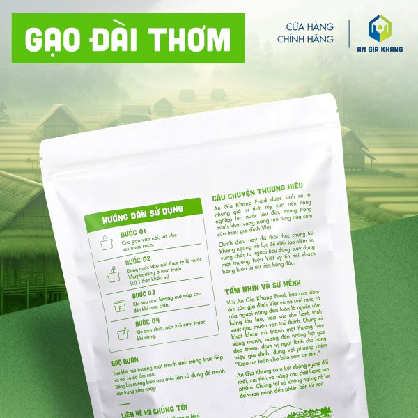 Gạo Đài Thơm An Gia Khang là một trong những dòng gạo thơm phổ biến và được ưa chuộng nhờ giá cả hợp lý, cơm dẻo vừa, dễ ăn, dễ nấu. Hạt gạo thon dài, trắng trong, ít bạc bụng, đều hạt và có mùi thơm nhẹ tự nhiên – đặc trưng của giống lúa Đài Thơm nổi tiếng.