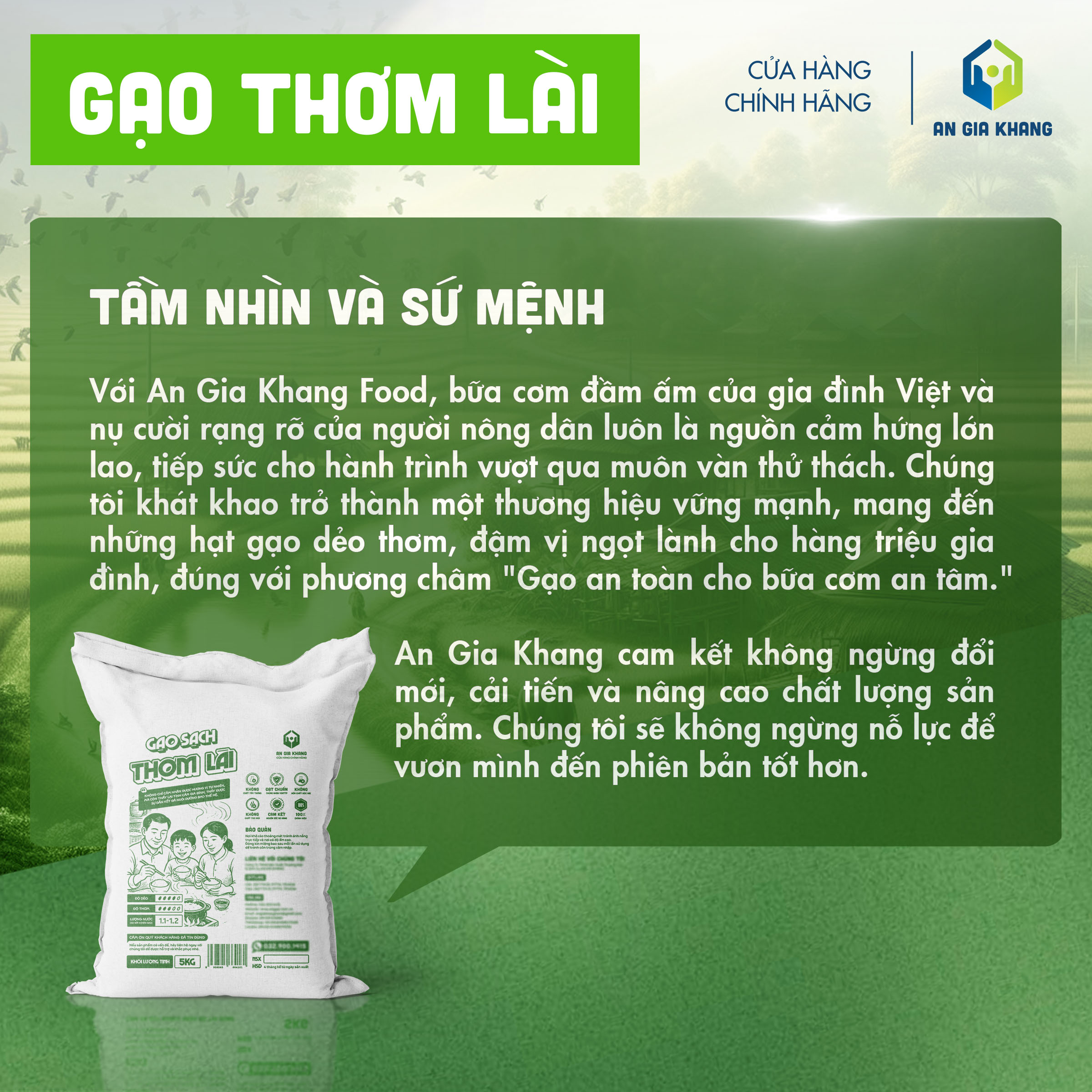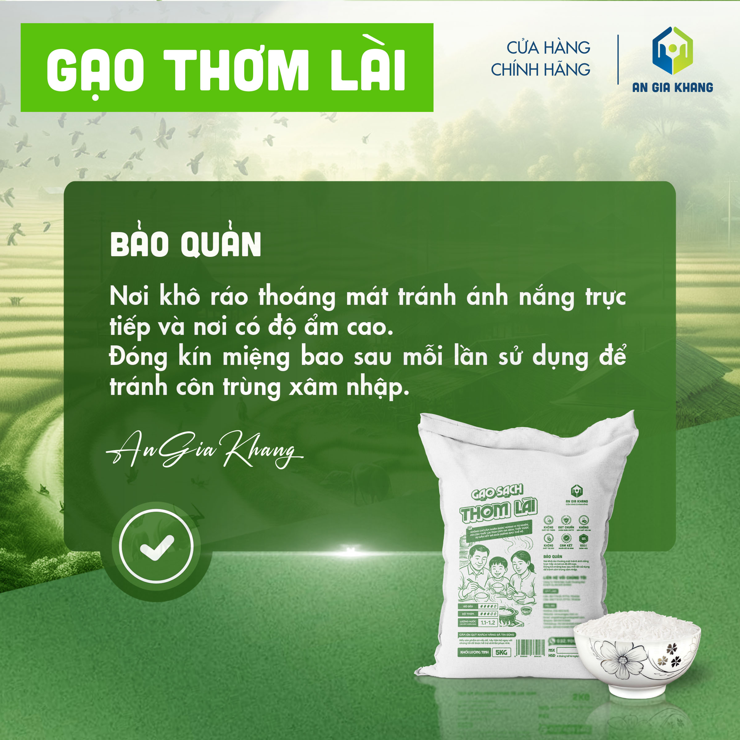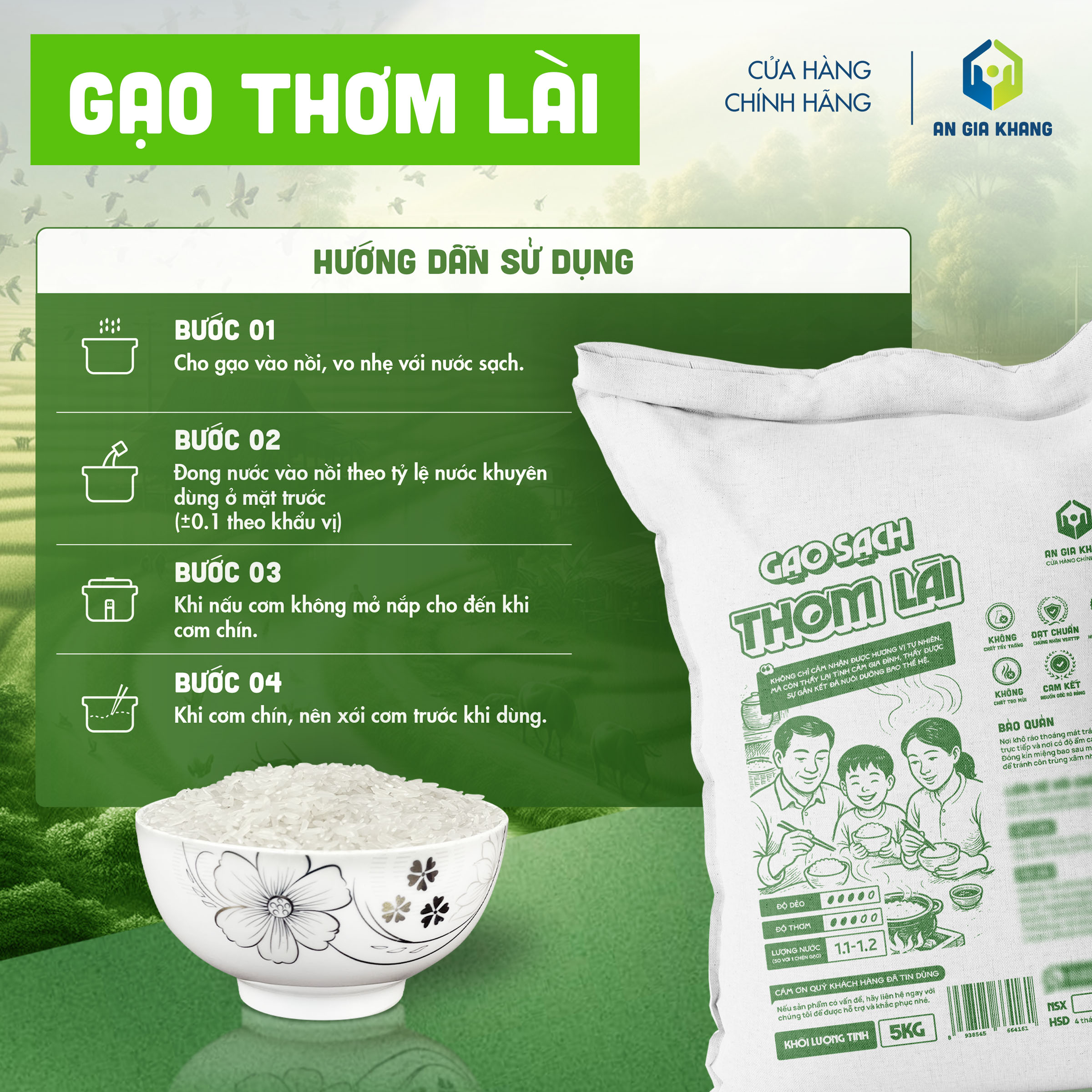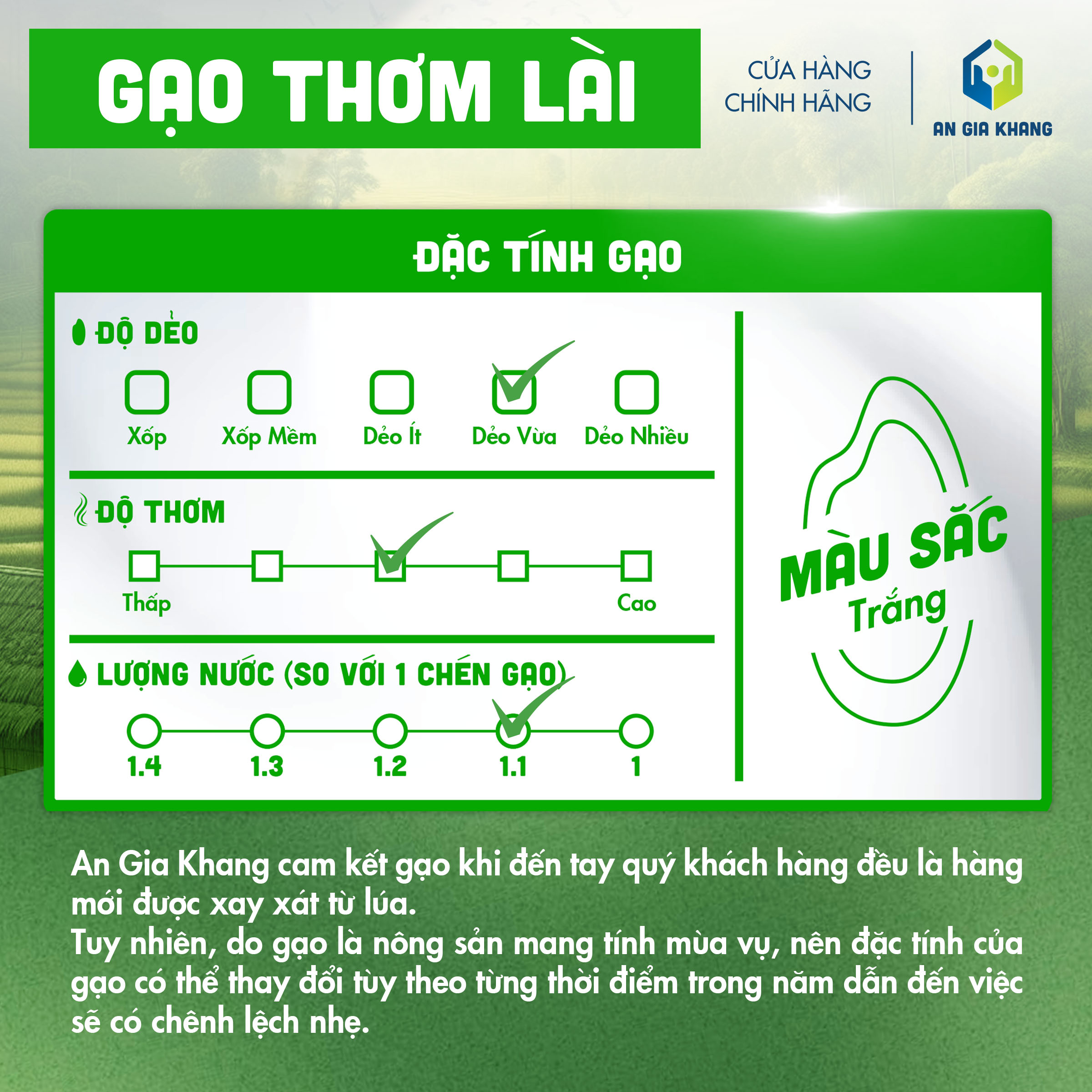 Được canh tác theo quy trình sạch, không sử dụng chất tẩy trắng hay tạo mùi, gạo Long Lài An Gia Khang là lựa chọn an toàn và thơm ngon cho những ai yêu thích dòng gạo thơm dẻo tự nhiên.