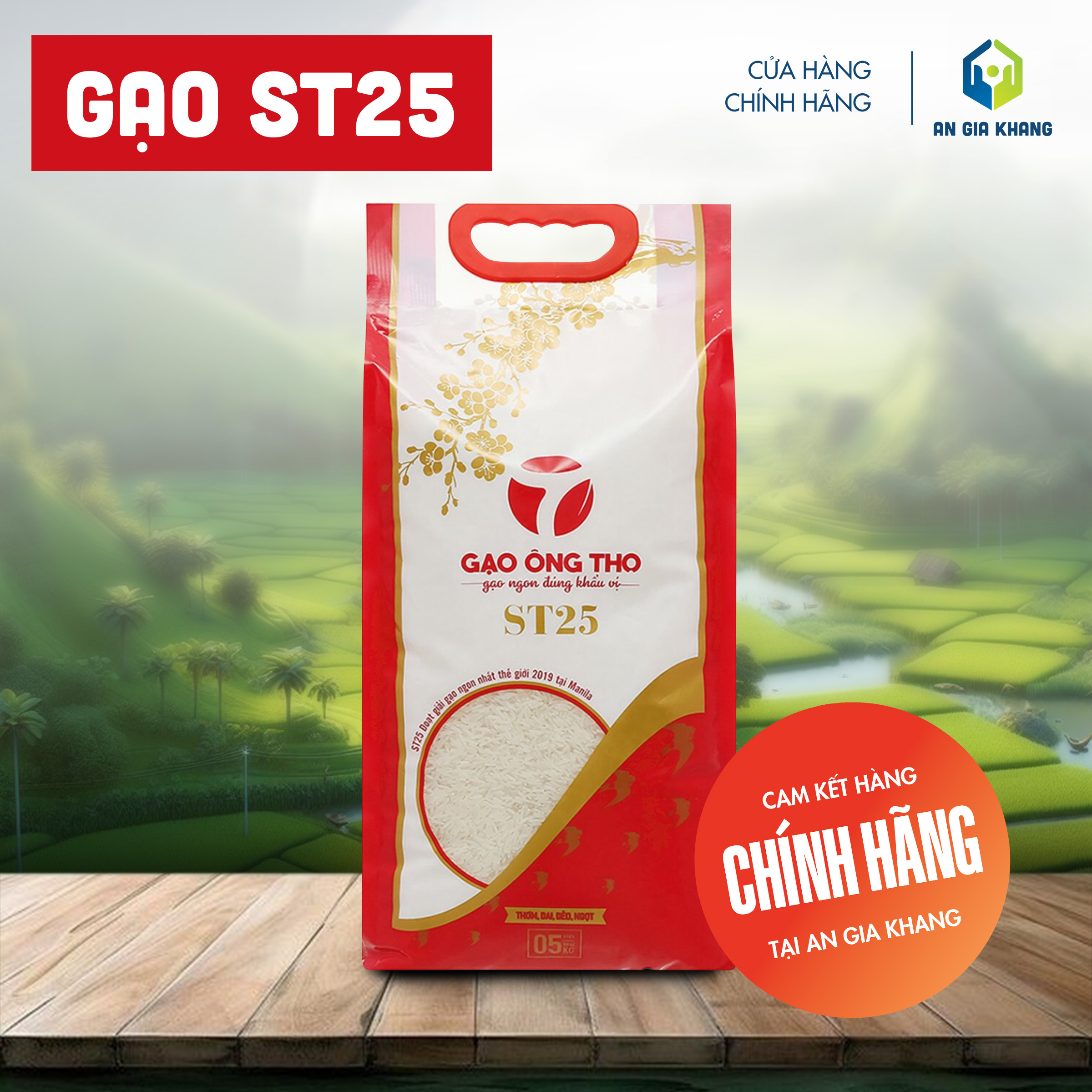 Gạo ST25 Gạo Ông Thọ là dòng gạo thượng hạng được sản xuất từ giống lúa ST25 trứ danh – từng đạt giải “Gạo ngon nhất thế giới 2019”. Hạt gạo dài, trắng trong, thon đẹp, ít bạc bụng, mang hương thơm tự nhiên thoảng mùi lá dứa đặc trưng.