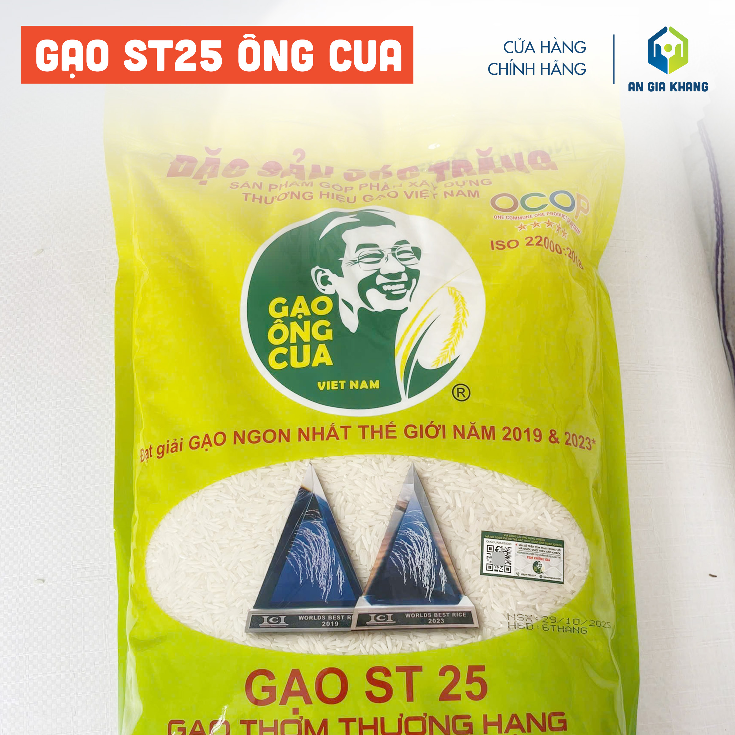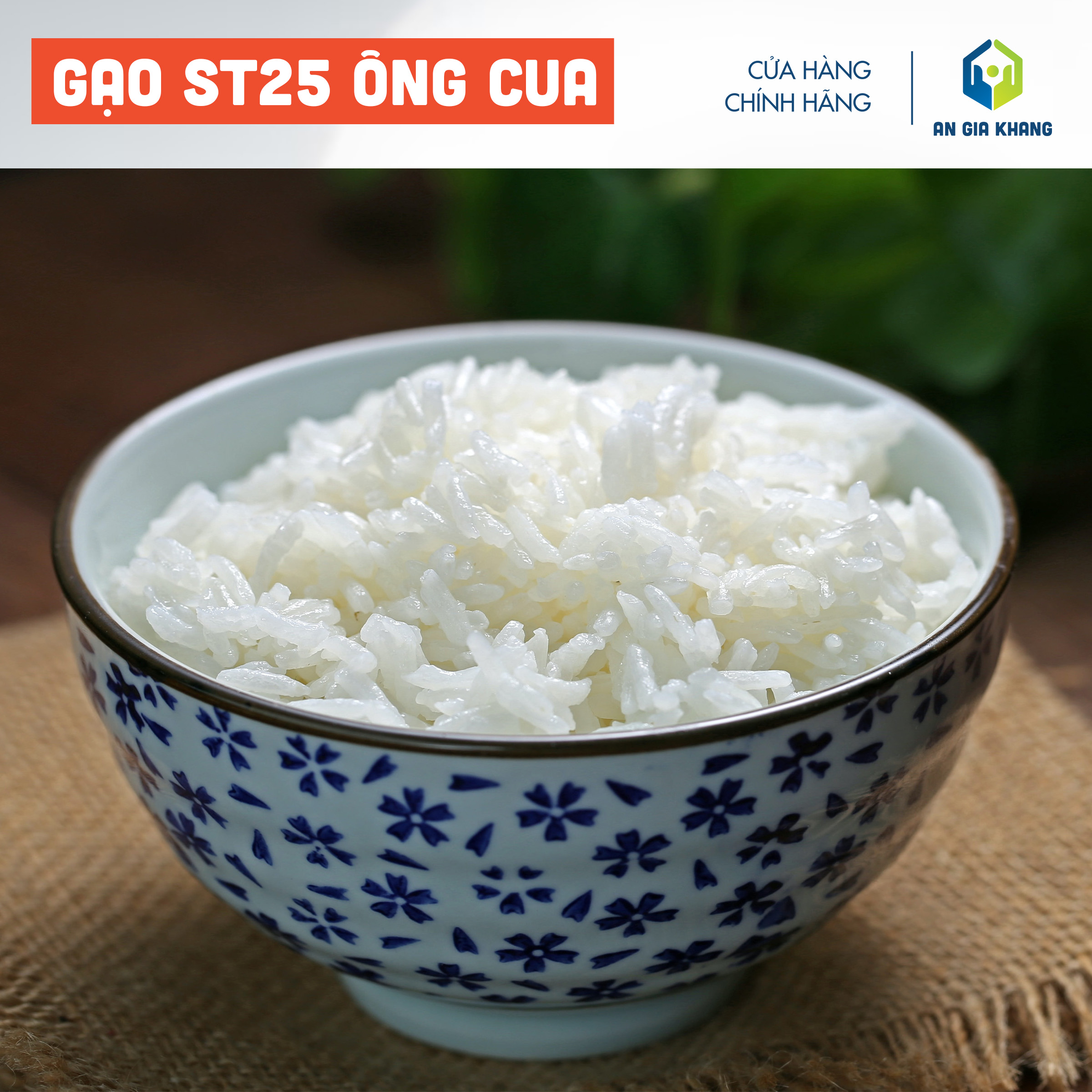 Gạo ST25 Ông Cua An Gia Khang là dòng gạo cao cấp thuộc giống ST25 nổi tiếng, được lai tạo bởi kỹ sư Hồ Quang Cua – “cha đẻ” của giống gạo từng đạt danh hiệu Gạo ngon nhất thế giới năm 2019. Hạt gạo dài, trắng trong, thon đẹp, ít bạc bụng và có hương thơm tự nhiên dịu nhẹ như lá dứa.